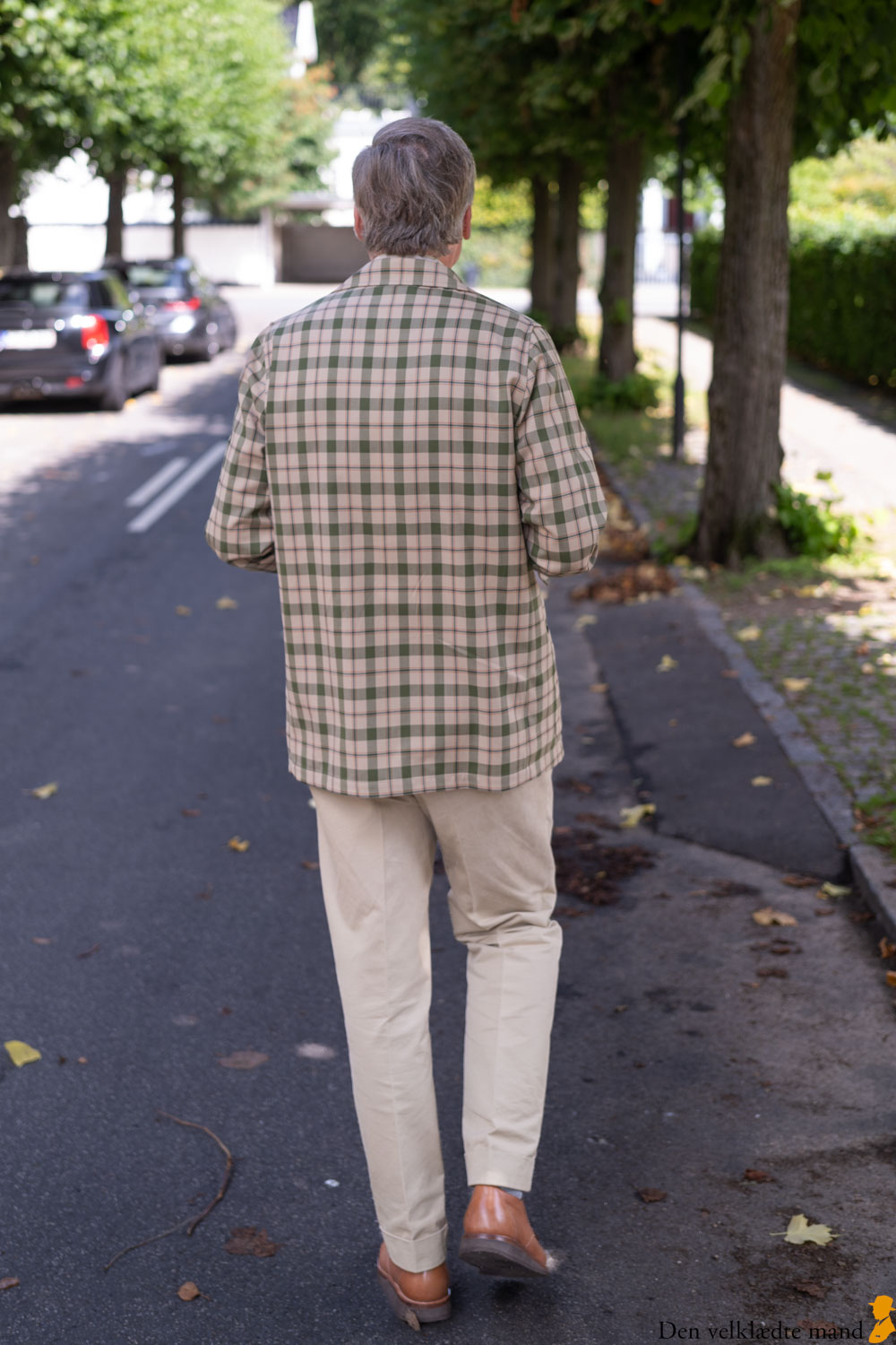 De knækkede hvide bomuldsbukser har en diskret, grøn tone, der gør dem velegnet til jakken, synes jeg. En koldere knækket hvid ville støde mod de grønne tern. Mens man må give køb tøjets faste form, skal man være desto mere opmærksom på tøjets farvenuancer.