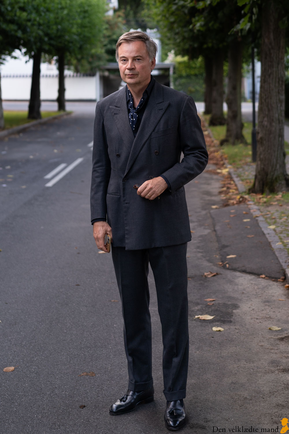 Nej, jeg er ikke klædt i egentlig sort, men i mørkt tøj. Det handler om raffinement. En kvinde i en helsort kjole giver mening, men med flere tøjdele i spil, som ses i herredragten, tilfører man sin tøjstil sofistikation ved at lade dem brydes diskret og få en figur hver især. Det er min konklusion. Nuancemæssigt gør jeg nærværende eksempel brug af koksgråt, midnight blue, marineblåt (med hvide prikker) og sort (skoene).
