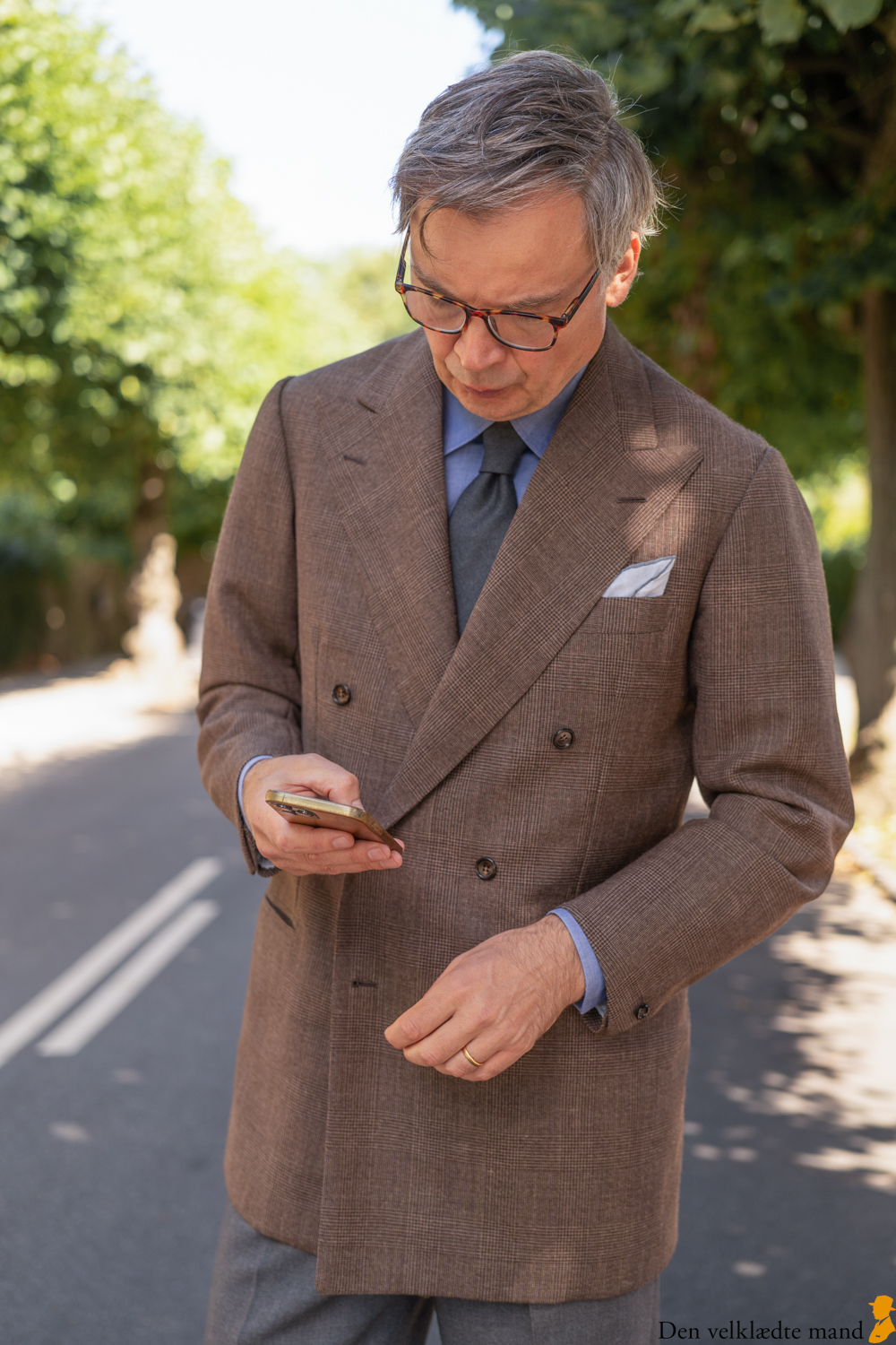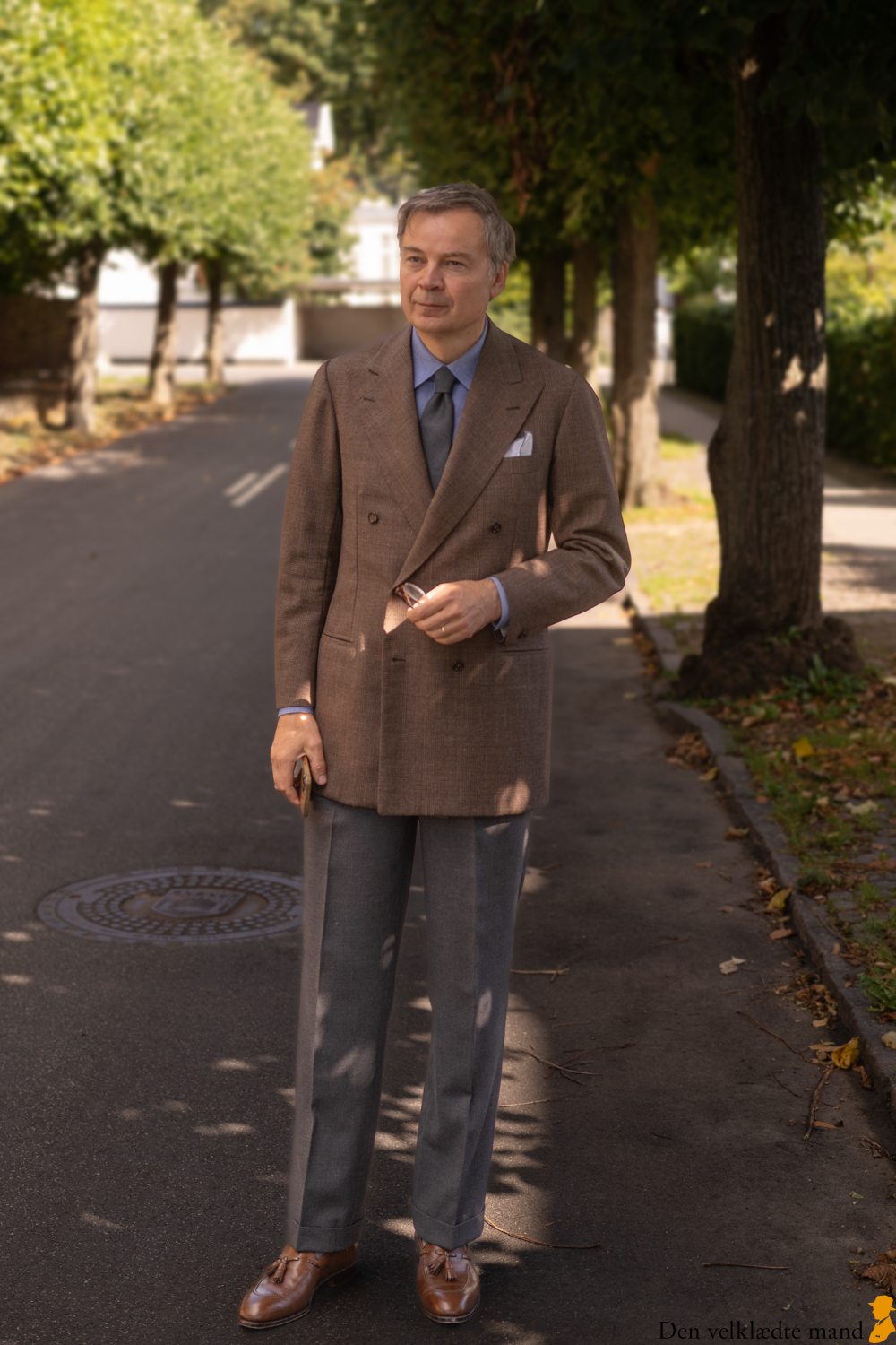 I nærværende indlæg forsøger jeg at vise, hvordan man kan gå nedtonet klædt. Jeg synes, det fungerer. Du forstyrres af skjorte og lommetørklæde. Desuden kan du ikke lide, at jakken (også) er en habitjakke. Samlet set ser jeg delene som lys- og kulørmæssigt harmonisk afstemt med hinanden og tilmed funderet i tradition (bla. er brun jakke og grå benklæder sportsjakkestilen par excellence).
