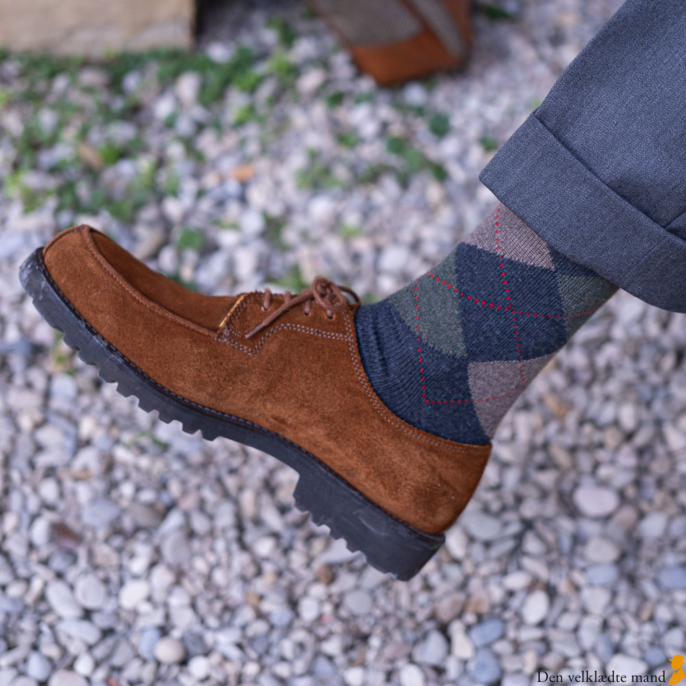 På nærværende foto bærer han et whipcord-jakkesæt, syet af en polsk skrædder. Frakken er lodenmodellen. Og fødderne har han stukket i et par randsyede ruskindssko ready to wear fra østrigske Ludwig Reiter.