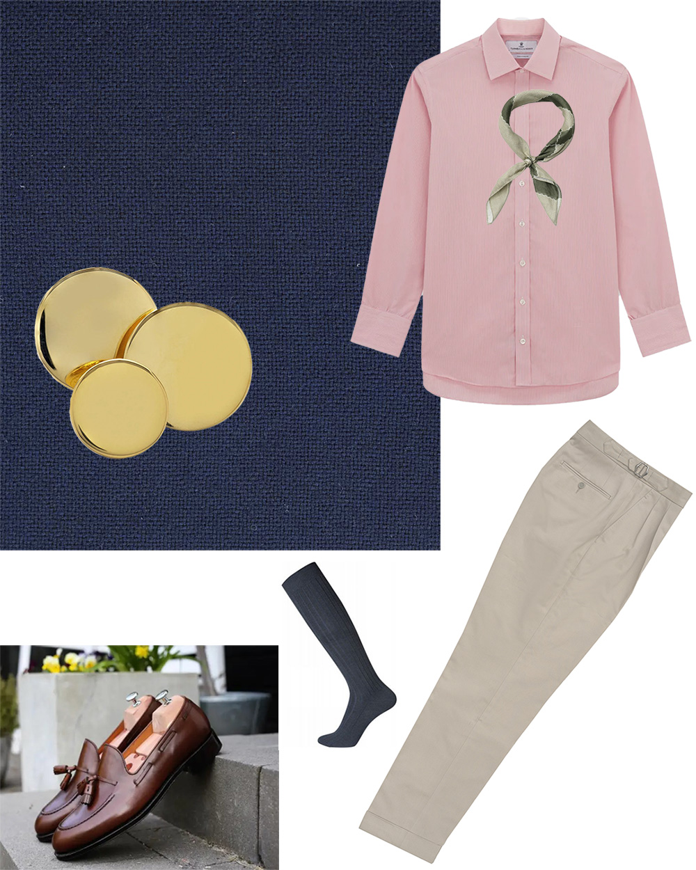 Og en blå hopsack må jeg naturligvis medtage. Det er den, som ni ud af 10 ender med, og som jeg måske også falder tilbage på. Den kan kombineres med anden beklædning på utallige måder. Her er en af de flamboyante udgaver med pink skjorte og charmeklud.