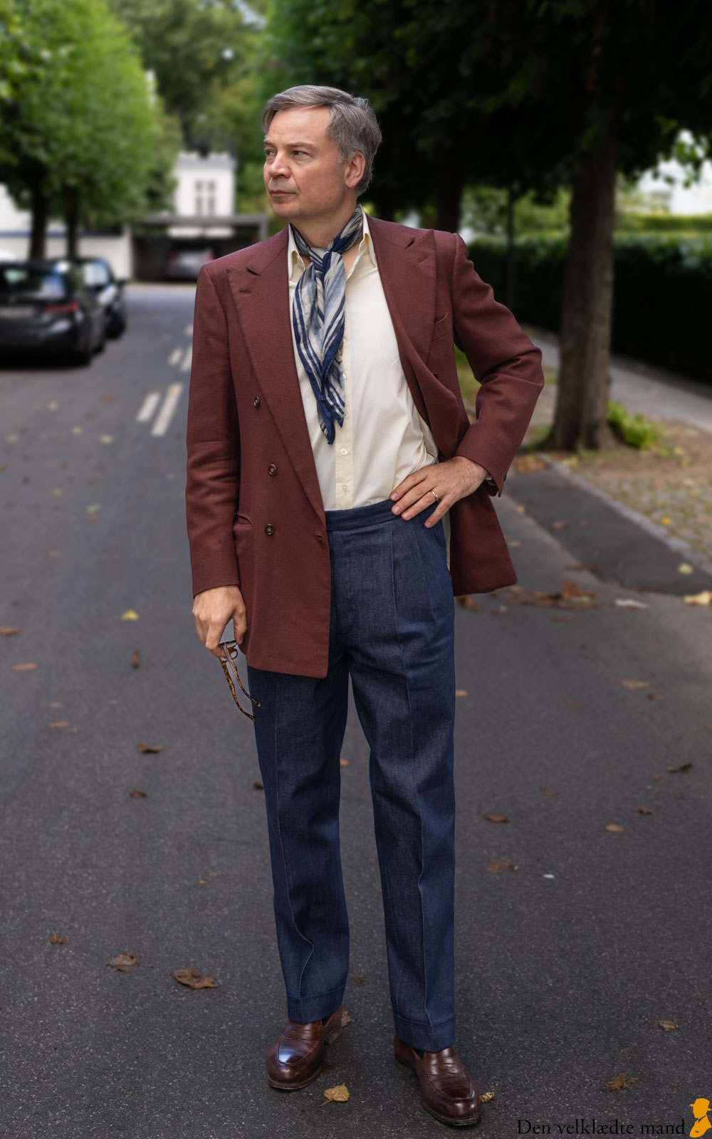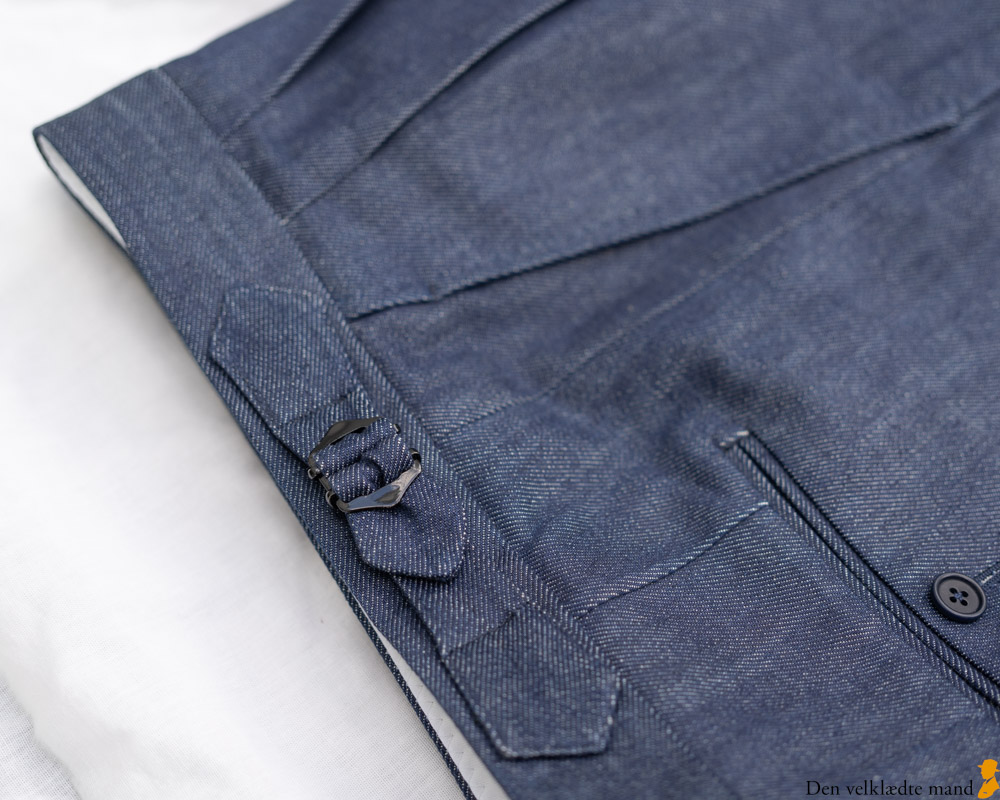 Jeg havde vovet mig ud i et par skræddersyede jeans med dobbeltlæg, pressefolder og opslag, i det omfang man kan tale om jeans, når jeg designmæssigt afviger så meget fra det traditionelle jeansdesign. Kan være, man rettere skulle benævne dem benklæder af denim?