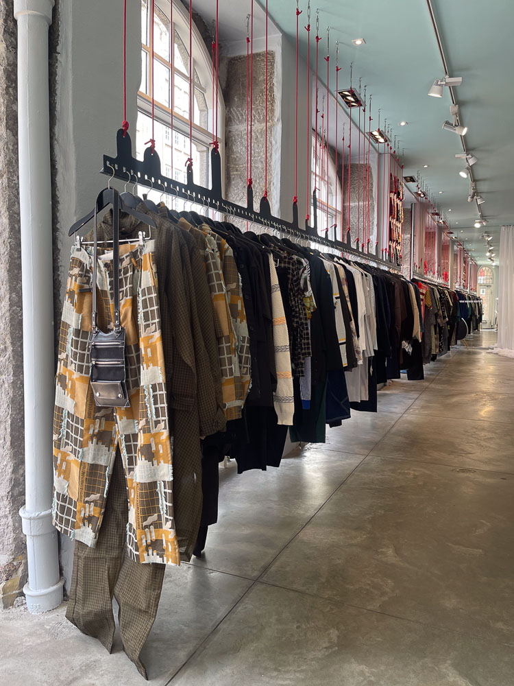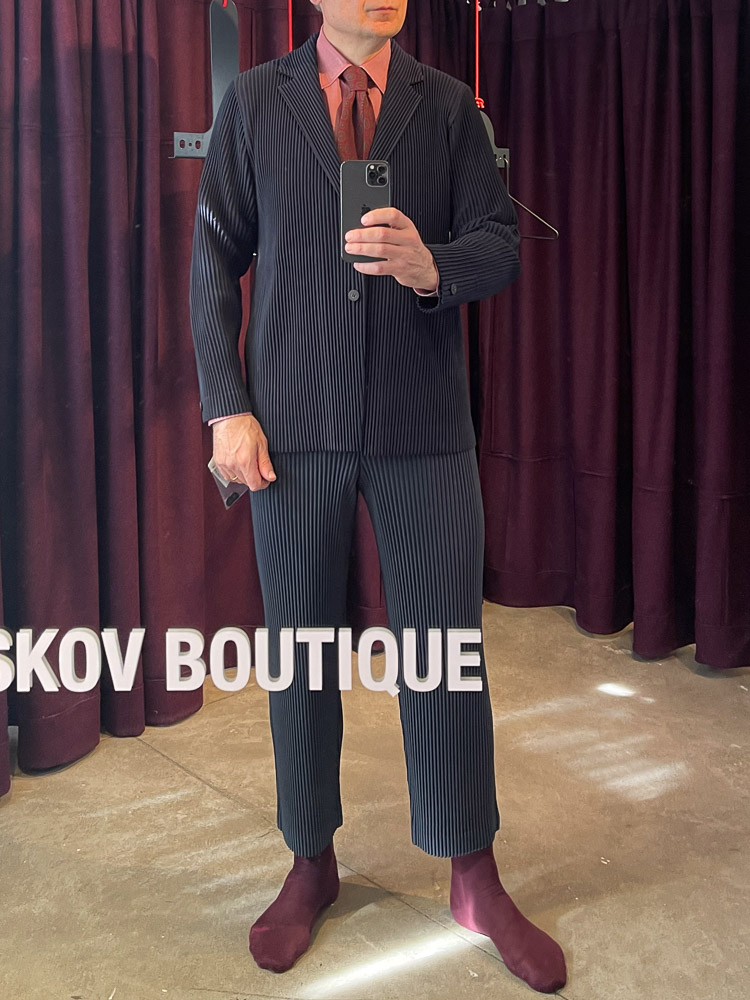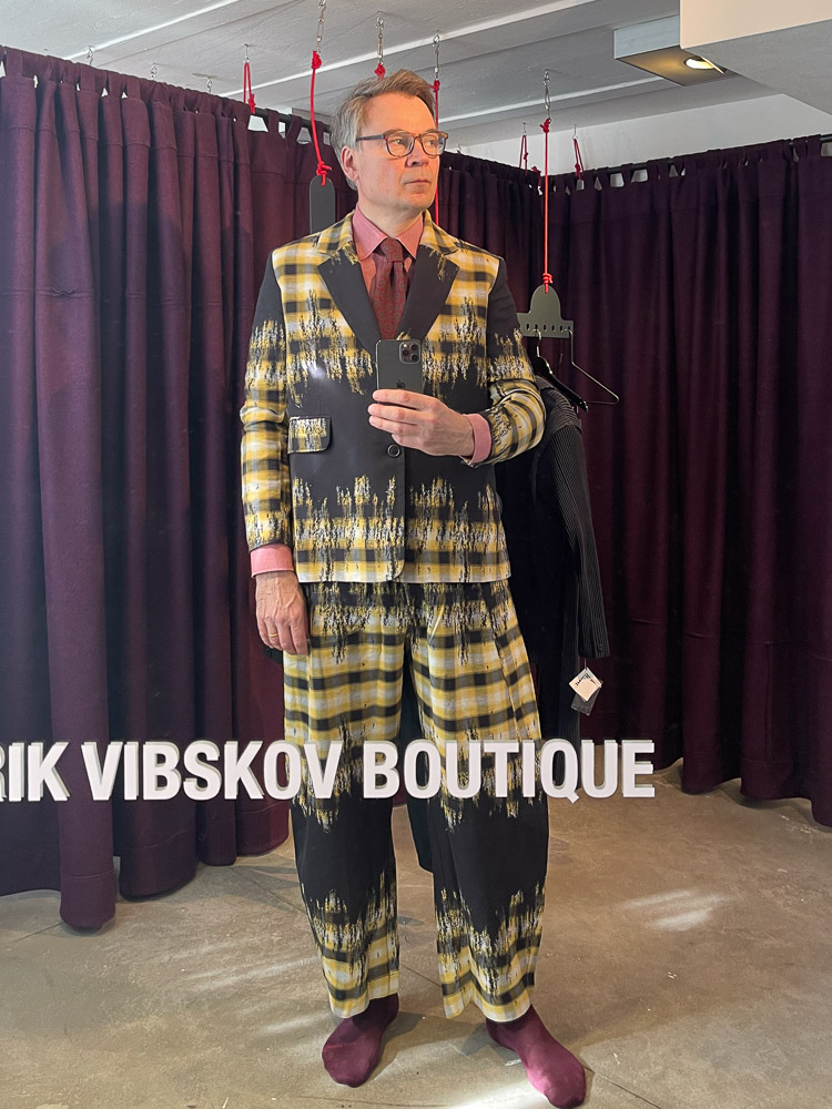 Til sidst prøvede at et elastisk jakkesæt fra det japanske mærke Issey Miyaki. Henrik Vibskov har sammen med sine egne design andre, nøje udvalgte.