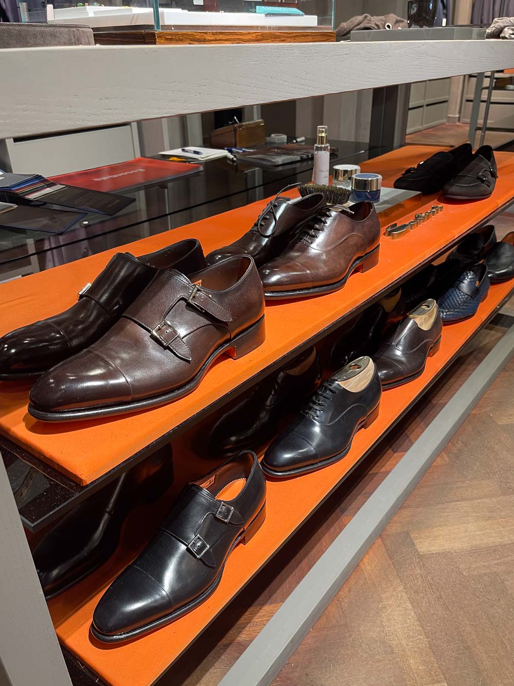 I bunden af butikken finder man også Bindesbøls bud på klassiske herresko. De er fra Santoni, og de er for gejlede i udtrykket til min smag, og flere modeller vil være gennemsyede, ikke randsyede. Der findes mere for pengene i prislejet eller det halve, fx hos Velasca.