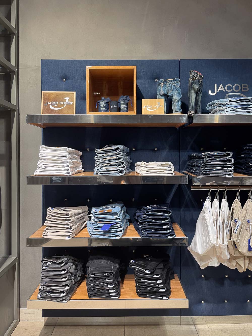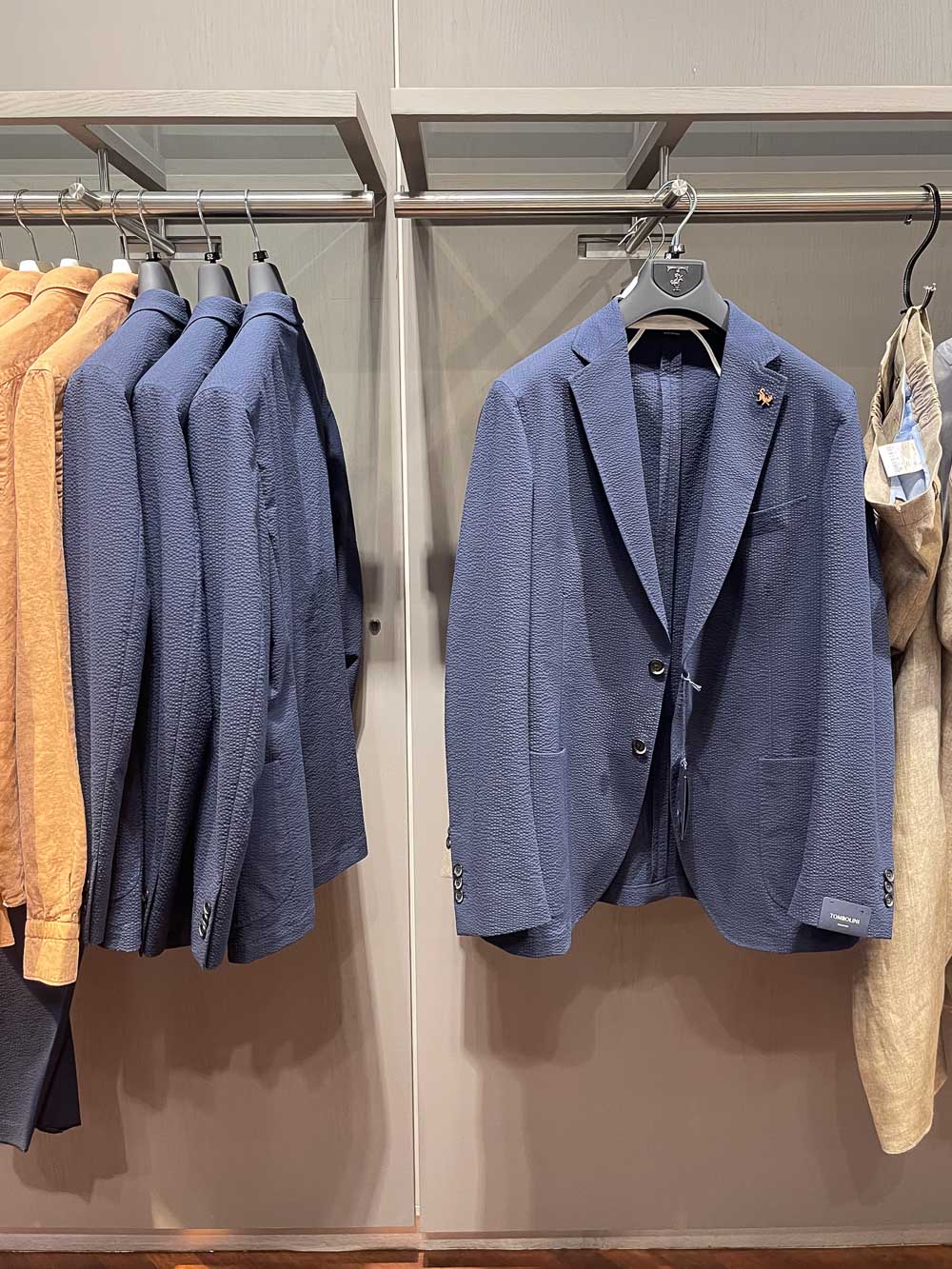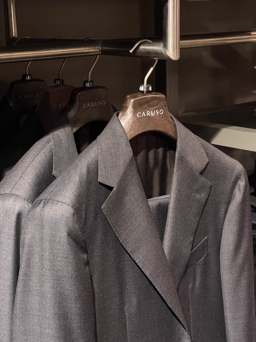 Traditionel konfektion kan dog endnu forefindes i butikken, bagerst, hvor der hænger gråt, blåt og brunt på bøjlerne fra Caruso, typisk omkring 18.000 kr. for et todelt sæt.