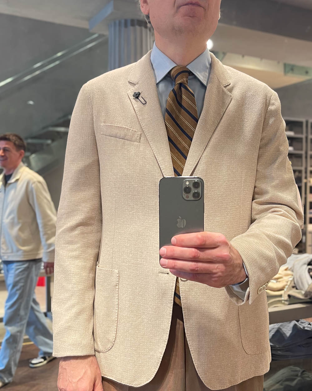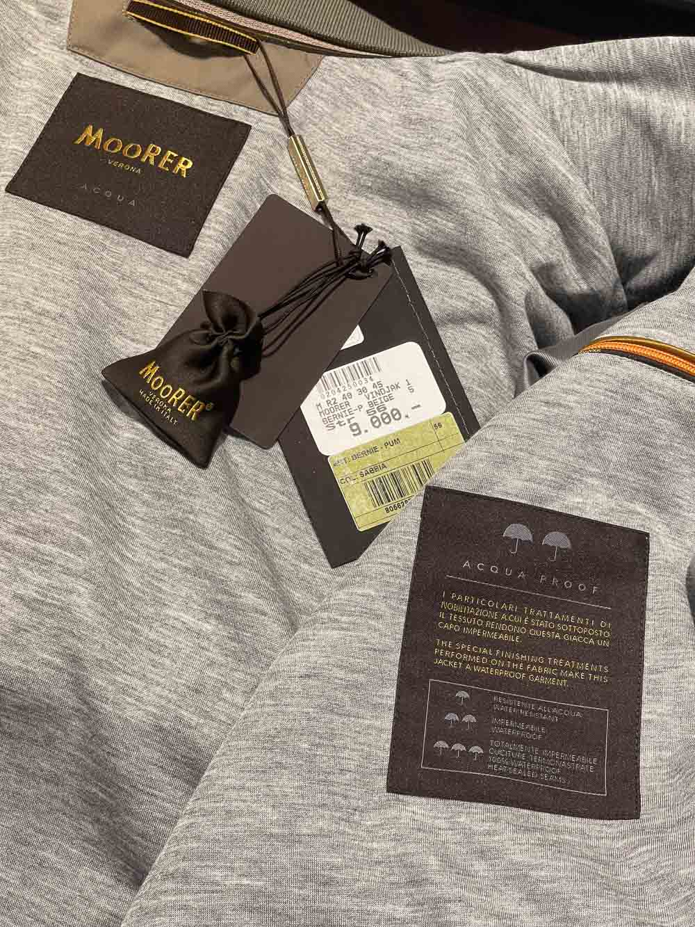 Jeg prøvede i første omgang en vindjakke fra firmaet Moorer i et meget udsøgt, lækkert tekstil og med små, raffinerede detaljer, hvis man så efter ved lommer og foer. Som smart casual-vare, toppen af poppen, ingen tvivl. 9.000 kr.