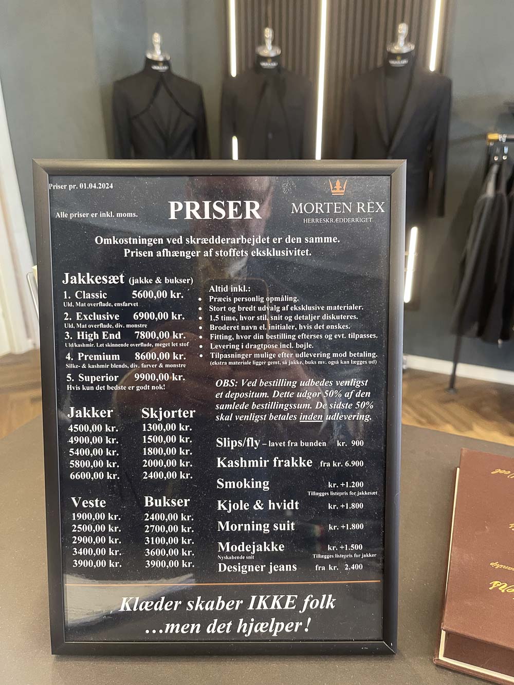 Hos Morten Rex er prisen lidt højere – fra 5.600 kr. I sammenligning med et bestilt jakkesæt fra Oscar Jacobson eller Suitsupply i samme prisleje, ved jeg godt, hvad jeg selv finder mest attraktivt – det er ikke den slags, som jeg så prøver på hos Morten Rex.