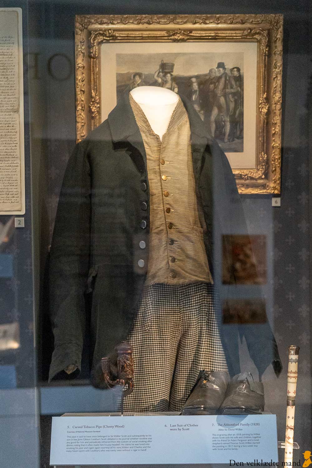Og man ser de klæder, han bar på sin sidste dag i livet: Jaket, vest og ternede bukser i shepherd’s check samt sorte lædersko.