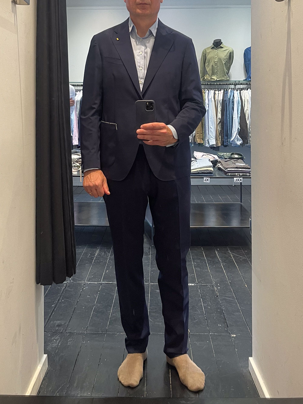Den søde sælger mente, at bukserne blot skulle lægges lidt op, og det generede mig, fordi jeg eksplicit havde sagt, jeg kunne lide mere vidde i jakke og bukser og havde demonstreret med min præference med det tøj, jeg bar på dagen i butikken. Men han havde ret i den forstand, at oplægningen af bukserne var, hvad man rimeligvis kunne gøre med den habit, hvis jeg skulle købe og gå med den.