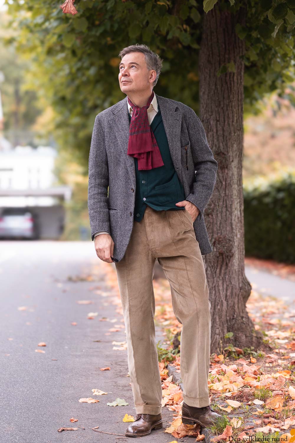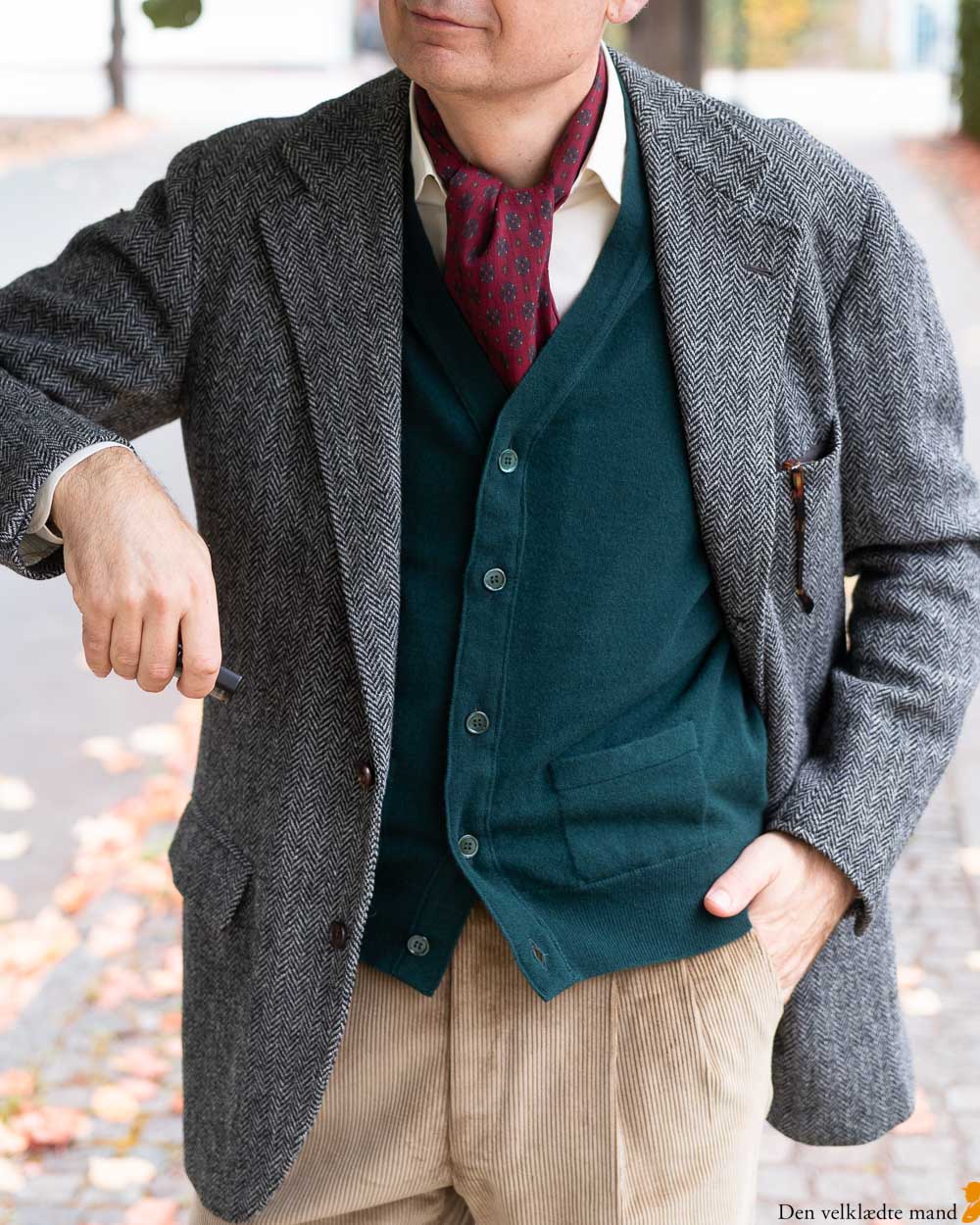 Selv om temperaturen ikke just var lav nok, vovede jeg mig i Harris Tweed-jakke og fløjlsbukser den ene dag og testede en ny flaskegrøn ærmeløs cardigan sammen med rød charmeklud og flødehvid skjorte.