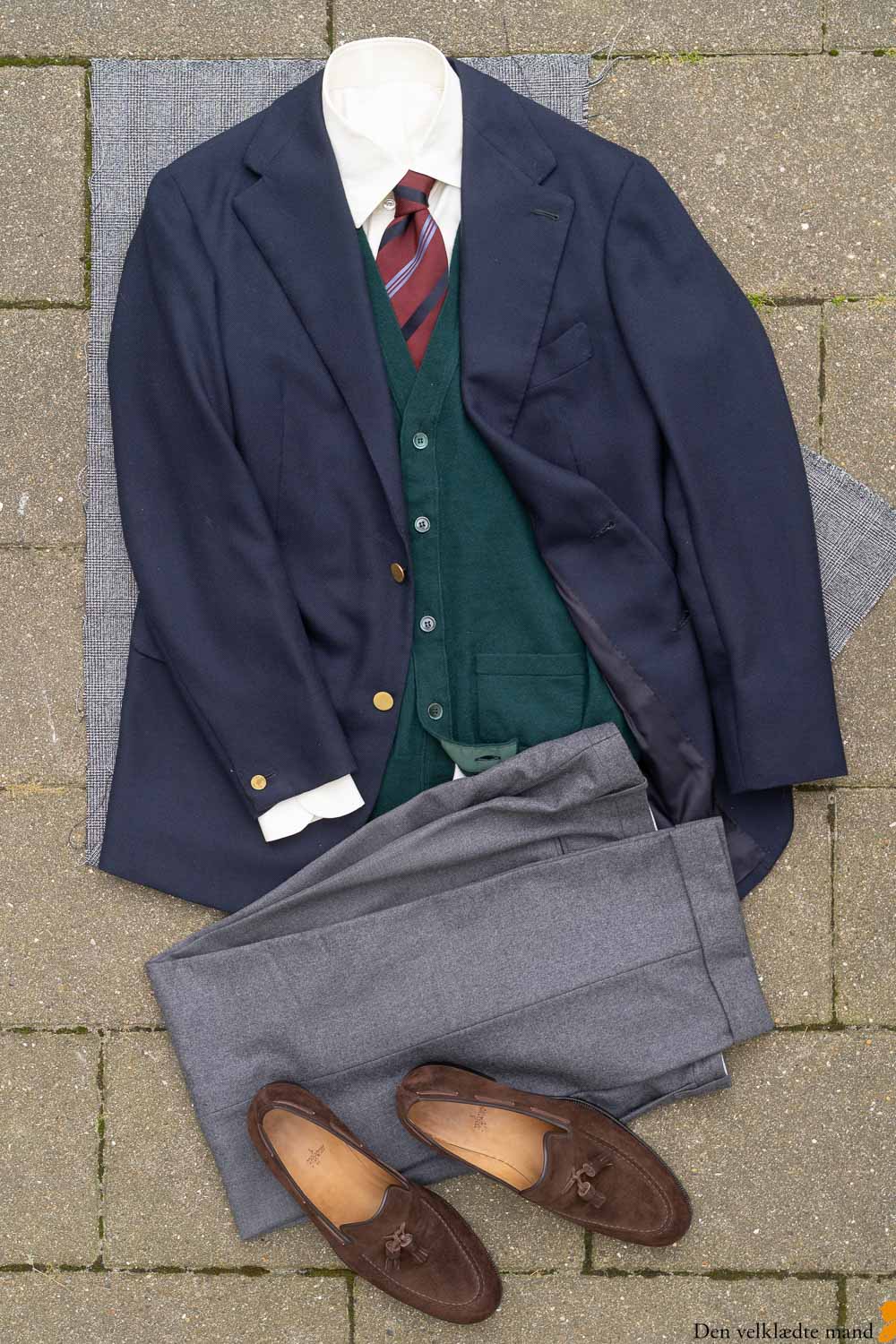 Man kan også benytte en ærmeløs cardigan under en blå blazer og med grå flannelsbukser nederst. I den forbindelse bør man også binde slipset. Igen skal man have et blik for farverne. Man vil gerne have, at cardiganen integreres i tøjstilen og ikke stikker tydeligt ud. Det indebærer, at man har farver i jakke og/eller slips, der kan matche og balancere cardiganens farve.