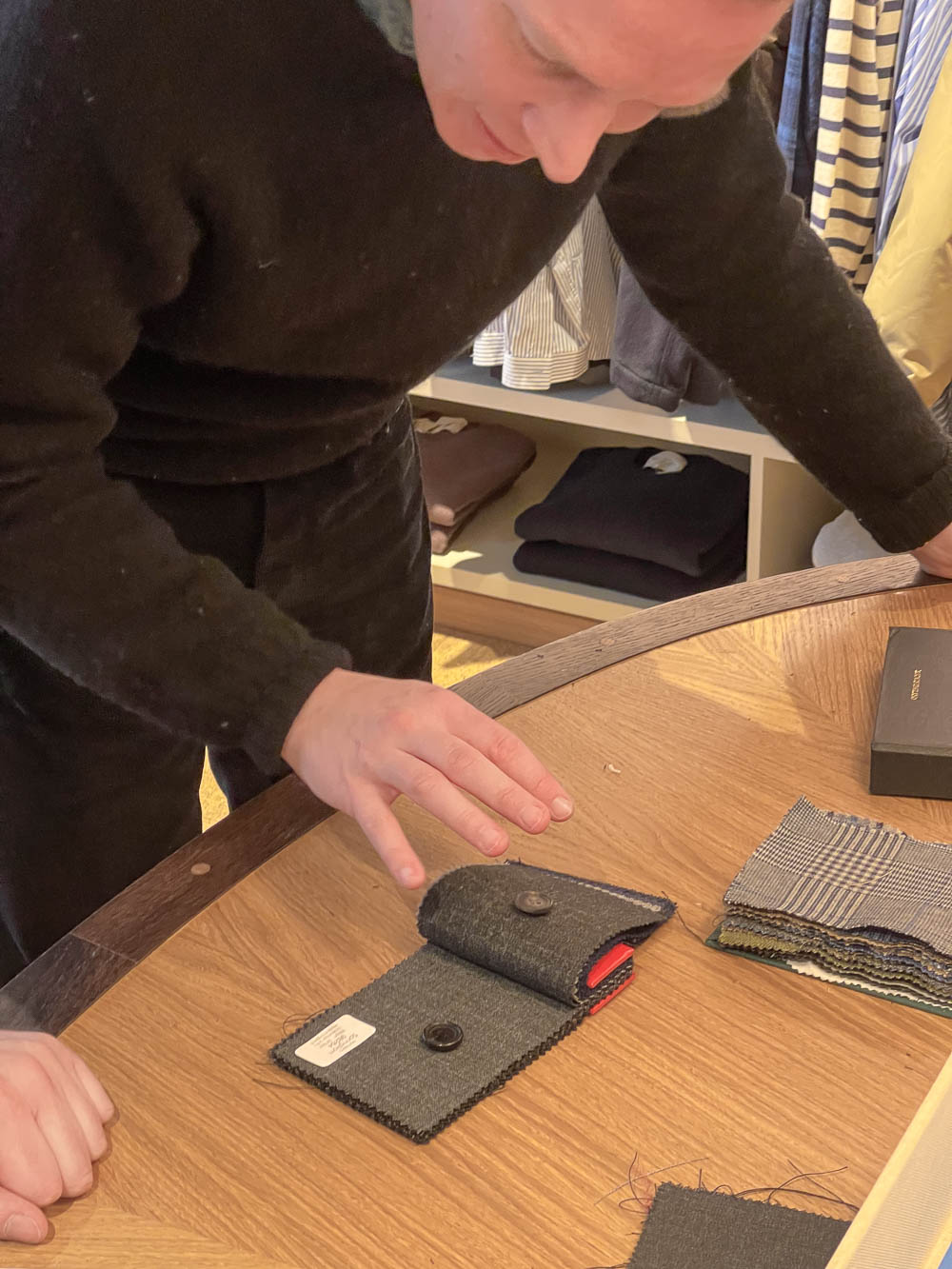 Kunden var arkitekt Julius Nielsen. Han har stået for design og indretning af Goods’ butik, og han har tidligere fået syet et jakkesæt i forbindelse med, at Drake’s var forbi Goods. Det var Goods, der foreslog Julius, da jeg spurgte, om jeg kunne følge et bestillingsforløb hos dem.