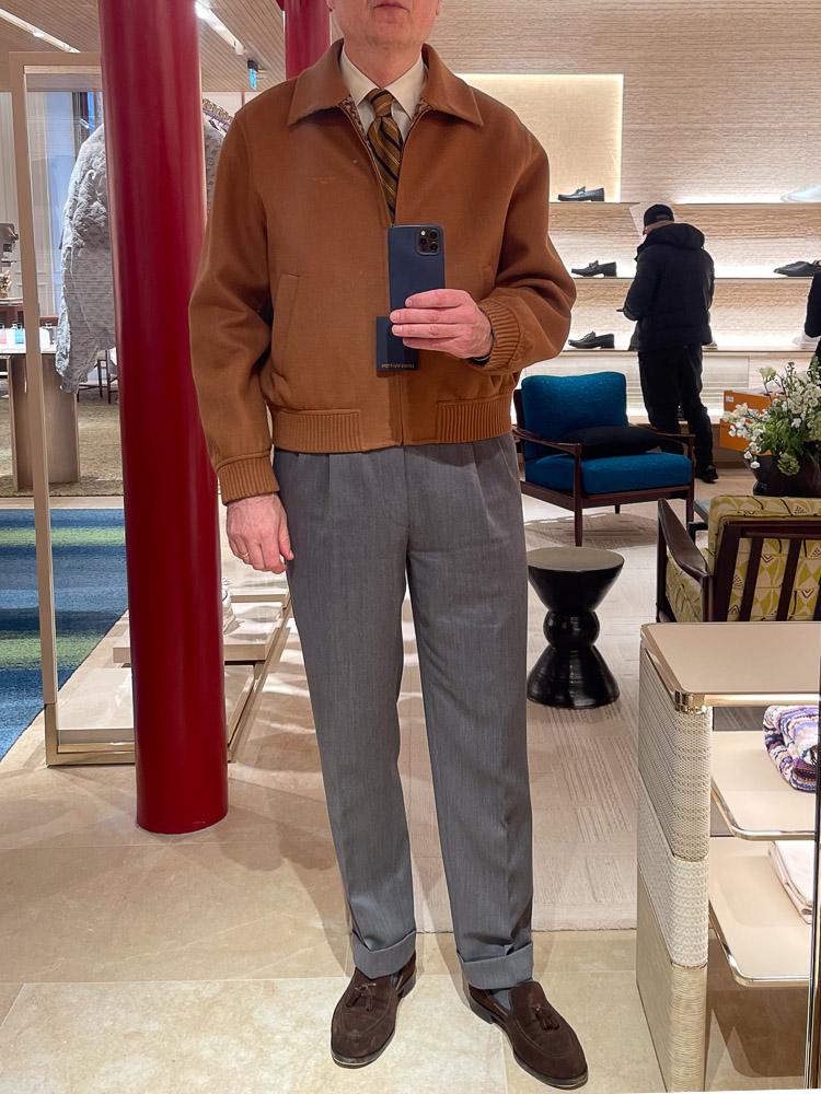 Væsentligt bedre oplevelse var det at prøve en catalinajakke i et kameluldsagtigt uldstof til 25.000 kr. Designet med den store krave kunne jeg lide.
