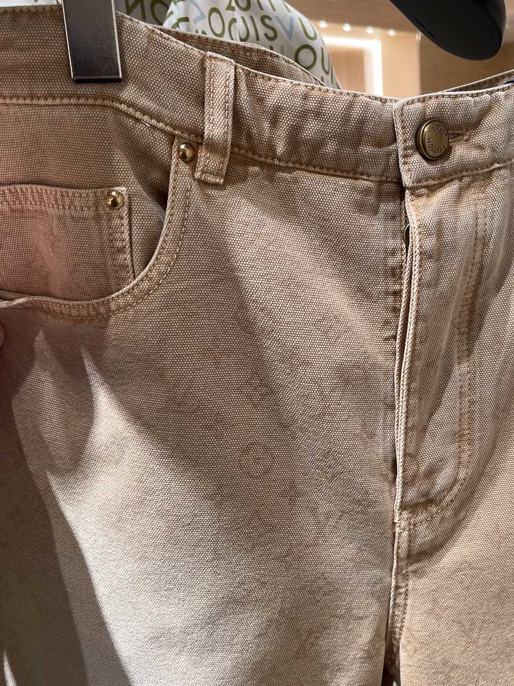 Herreafdelingen ligger til venstre, når man er trådt ind i butikken. Jeg blev mødt af mannequin i forfinede cargobukser, tyksålede sneakers, catalinajakke, stribet blå skjorte med broderet krave med et smalt stribet slips hængende under sig. Posituren var hvilende i hoften med en lille taske i højre hånd. Udtrykket fremstod alt i alt casual og bling’ende med et feminint strejf.