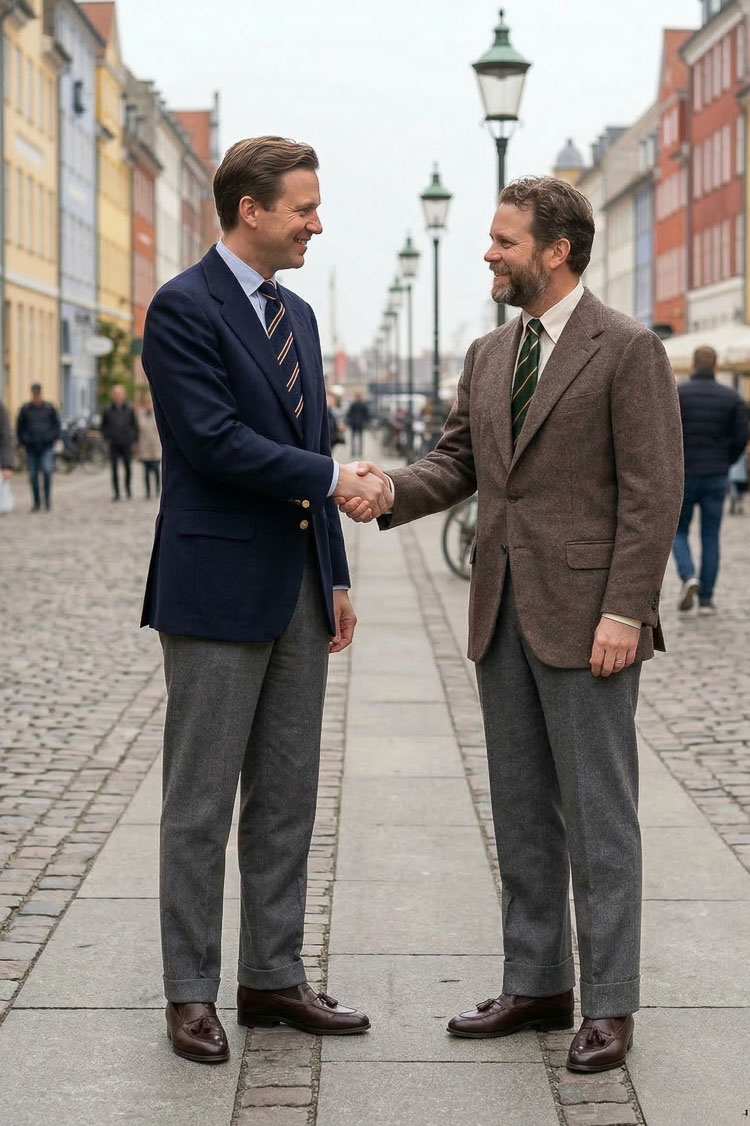 På det øverste foto mødes blazermanden og tweedmanden ved Nyhavn i København. Dem har jeg givet nærværende to skræddersyede jakker på, en blazer i marineblå hopsack og en jakke i meleret brun tweed.