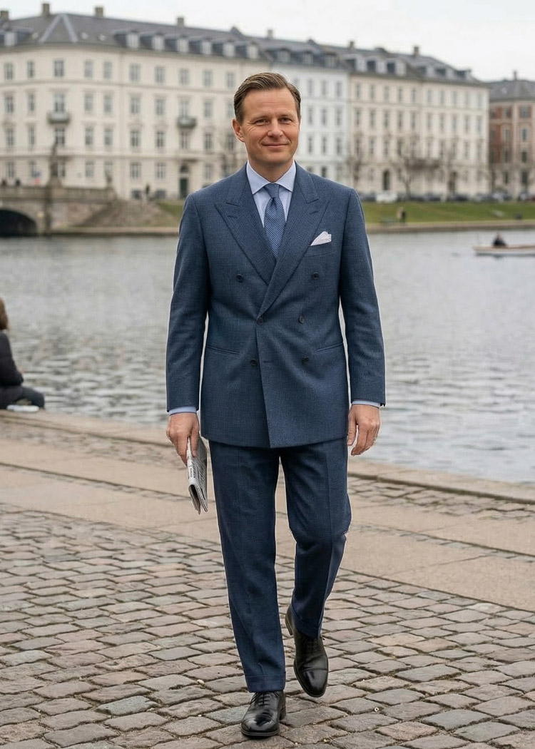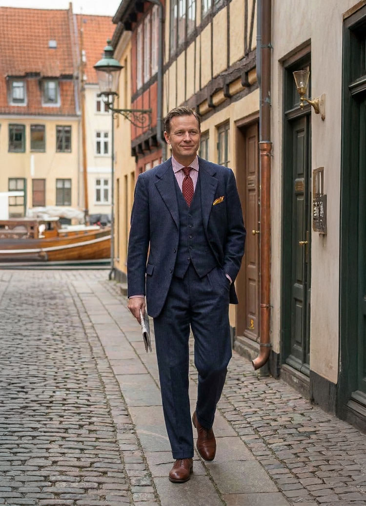 Vi tog tilbage til Nyhavnsområdet og en mand i den tredelte habit med rødligt og gult tilbehør viste sig på fliser og brosten.